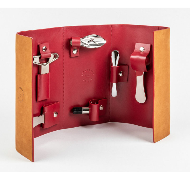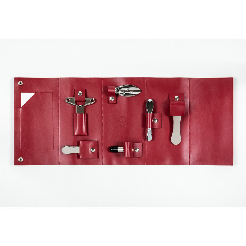Oeno Collection Nomad consists of the Garçon corkscrew in chromed metal, the Bilame Chromé corkscrew, the metal chrome foil cutter, the Pourer Leaf, the Model 54 champagne stopper, and a pair of cork pliers.