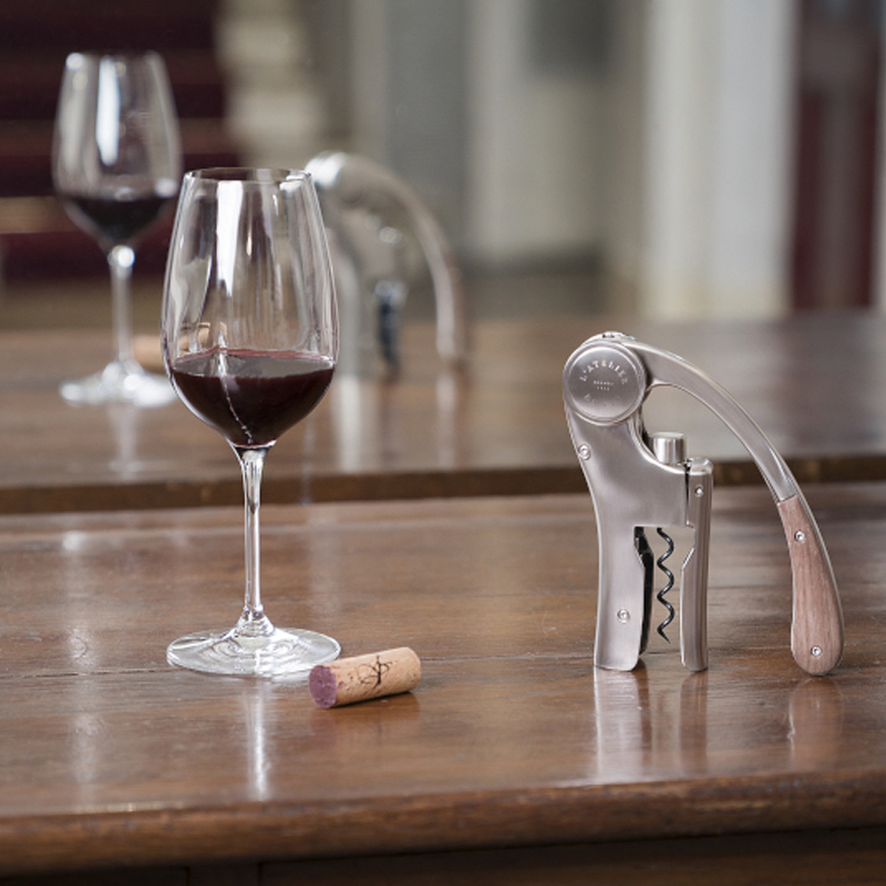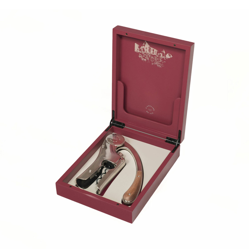 Opening the box reveals a moment of anticipation and delight. Nestled securely at its heart is an authentic vertical lever corkscrew from the renowned Oeno Motion collection, ready to gracefully open your most exceptional bottles.