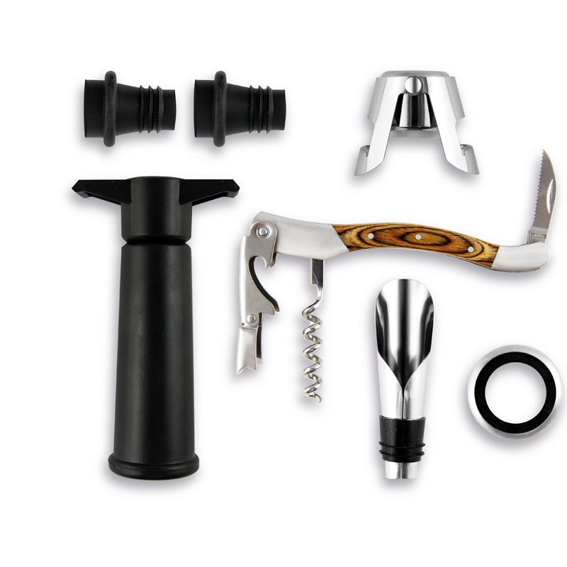 Desgined by Enrico Albertini, this professional corkscrew, champagne pliers, capsule cutter knife, and cap lifter is an essential set for any wine enthusiast.