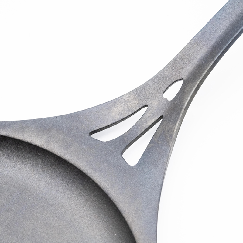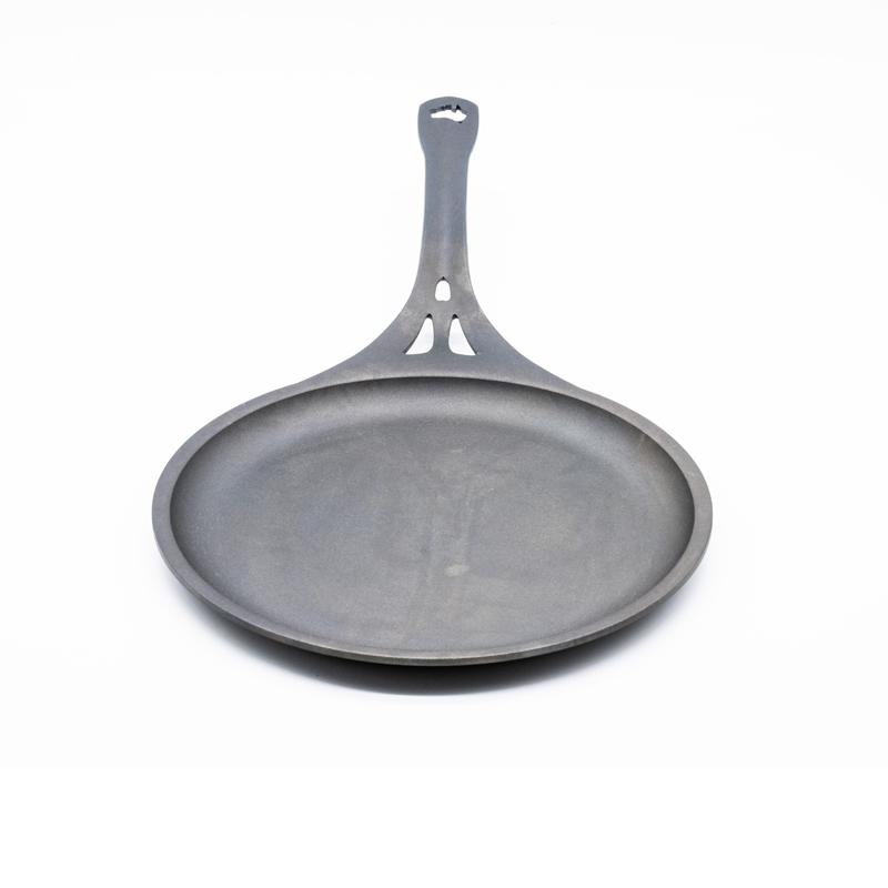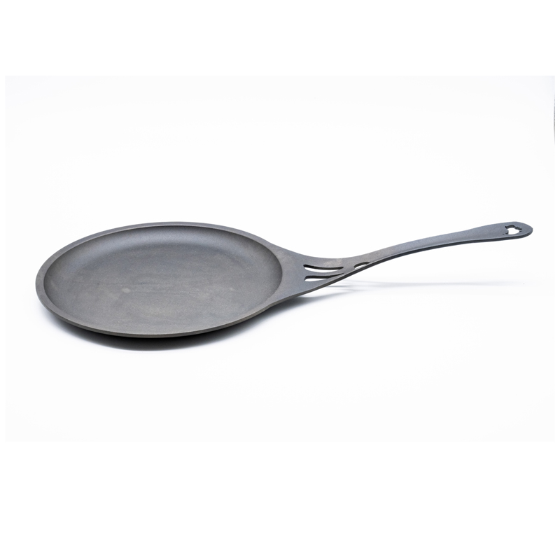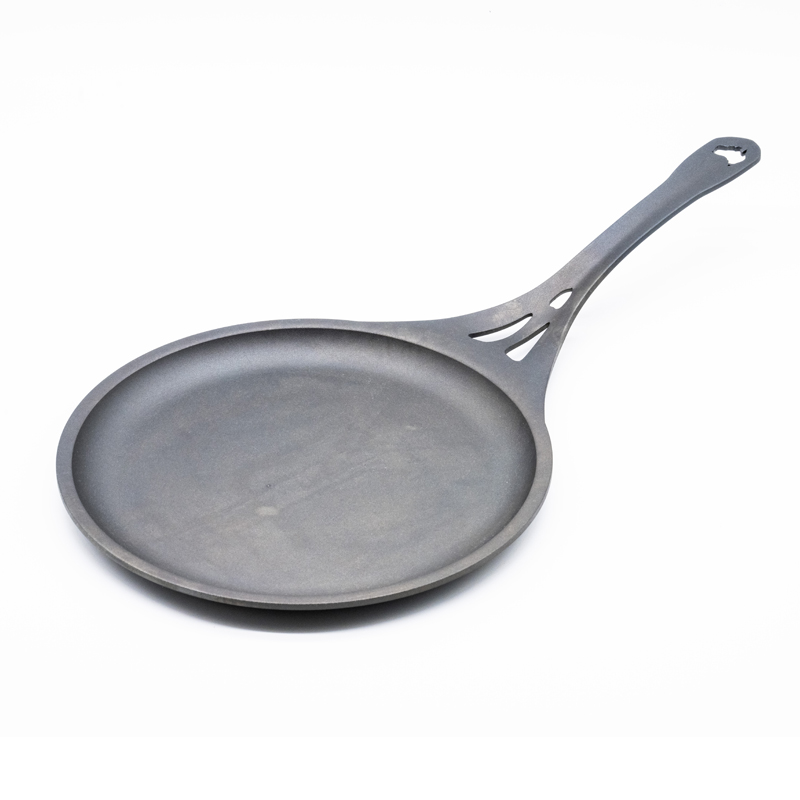 Unlike cast iron, which is poured into a mould after being melted down, wrought iron is made from a single flat piece of iron and shaped into a seamless pan. Wrought iron is half the weight of cast iron, more durable (it won’t crack if dropped), and heats quickly while retaining heat efficiently.