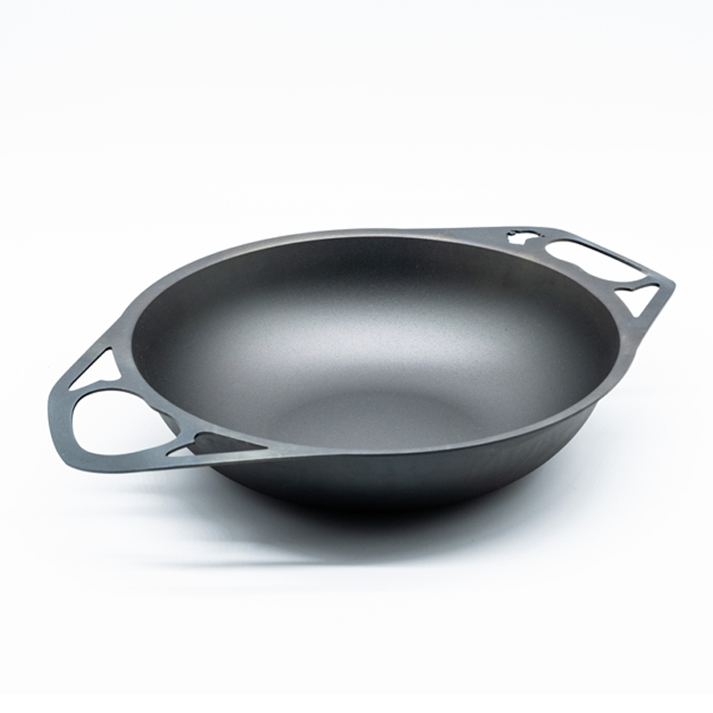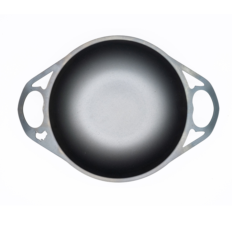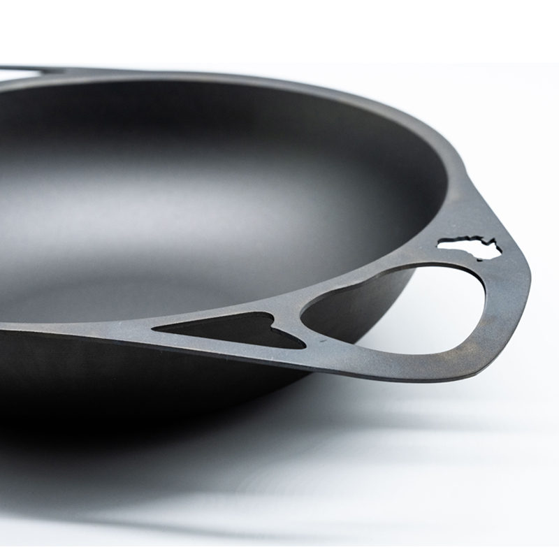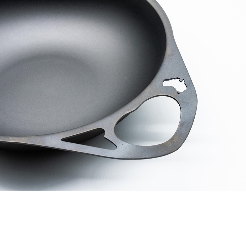 Unlike cast iron, which is poured into a mould after being melted down, wrought iron is made from a single flat piece of iron and shaped into a seamless pan. Wrought iron is half the weight of cast iron, more durable (it won’t crack if dropped), and heats quickly while retaining heat efficiently.